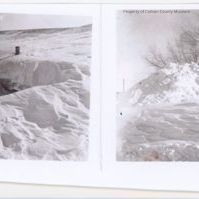 Two black & white scanned prints on one photo. Print on left is of snow drifts and snow banks around & up high on high line poles. Wires are smashed into the snow. Buildings are in the background. Print on the right is of a large snow pile in front of a house. Foreground is white with drifted snow leading to snow pile that looks like it's been plowed up. Roof with chimney and top part of house are visible in background.