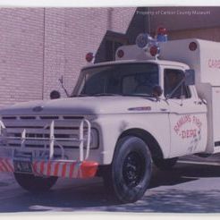 Color photo of a white fire truck. Truck has red and white striped bumper and a white heavy pipe grill. It has a box over the truck bed and there are compartments on the side. Printed on the door in red: "Rawlins Fire Dept." Printed on the truck bed cover in red: "Carbon County Rescue Unit.". There is a red light on top of the truck bed cover and two lights on the roof. A large siren is also on the roof. It is pared outside of a brick building.