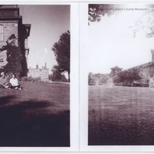 Two black & white scanned photos on one picture. Picture on left is of two women sitting on lawn on west side of court house. Building is multi-level stone with arch shaped windows with a widows walk on roof. Beyond part of old Central Building is visible and above that is steeple of Catholic Church. Vines are growing on Court House.