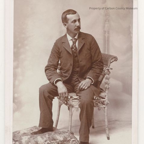 Update 1/2008: Black and white copy print. Studio portrait. Image of a man seated on a wicker chair with his right foot resting on a large patterned pillow on the floor. Painted backdrop behind. Man is wearing a dark 3 piece suit, white shirt, dark patterned tie and boots; he is looking off to the right side (his left).