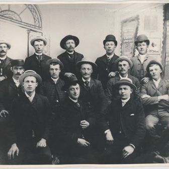 A black and white photo of three rows of men, all wearing hats, jackets and ties. The men are members of the Danish Brotherhood of Rawlins Lodge number 40. The photo was taken in 1892. The Rawlins Lodge was organized in 1890. This photos looks to be taken at a studio with a painted archway in the background. Printed on the back in blue ink: Taken 1892. Ole Larsen, Soren Frandsen, Niels Nielsen, Jim Larsen, Ole Frandsen, Chris Jensen, Andy Andersen, Hans Larsen, Soren Albert Hansen, Jack Johnson, Erick Jensen, Carl Jensen, Hans Jorgensen. Condition good but photo is warped and has a crease in upper left portion.Collection