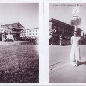 Picture on right is of a lady standing in front of a pole with a sign that reads "Wyoming U S 30" with an arrow below pointing right. Behind in the background is large multi-level building with sign on corner that reads "Karls Clothing Shop" This is Cedar St looking south towards the 400 block of Cedar. Vintage cars are parked on street & two men are crossing street.