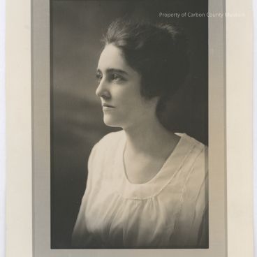 Black & white print. Studio portrait. Printed on off-white card stock with printed grey mat frame around image. Head & shoulders, near profile portrait of a woman wearing a scoop-neck dress/blouse. Painted backdrop behind. Her hair is pined up in back.