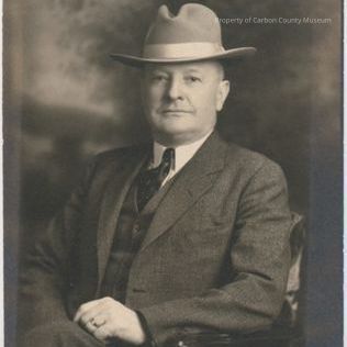 Black & white print of a studio portrait of a man dressed in a dark 3-piece suit, white shirt, dark tie & a Stetson type hat with a center crease in crown. His left arm is propped on his knee & a band type ring is on his ring finger. A shadowy background is seen side left.