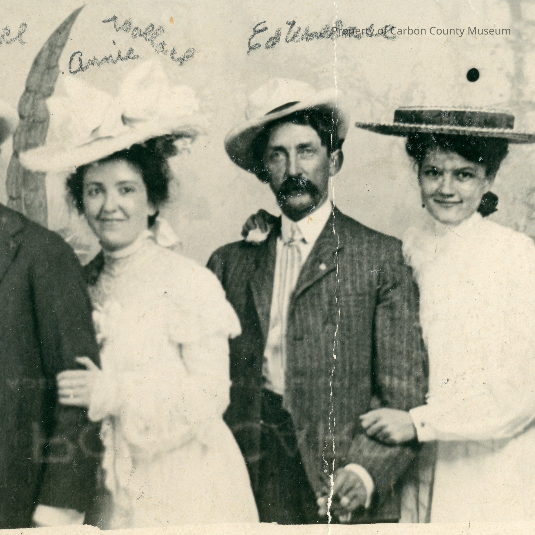 Update - 2009: Black & white print. Studio portrait. Printed on postcard paper. Half-length portrait of two men & two women standing in front of a painted backdrop. Women are wearing white long-sleeve dresses & hats. Men are in suits & ties & hats.