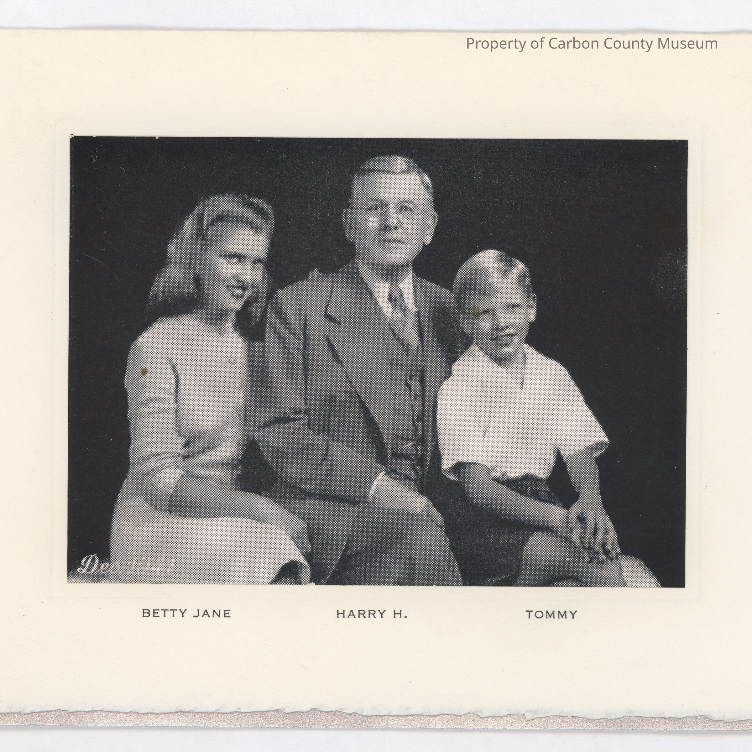 Update 2009: Black and white studio portrait of woman, man and young boy. They are all seated with the woman on the left of photo. She has on a light colored knit sweater and skirt, with buttons on front from neck to waist. Man is dressed in a three piece suite with white shirt and tie. Young boy has on dark shorts and a white short sleeve shirt. Lady has light colored long hair and has her right arm across her lap. Man is wearing glasses and has his right arm across his lap. Young boy has both his arms on his lap with one hand on the other. Printed on original negative in white: "Dec. 1941" Printed in black ink under people:"Betty Jane" "Harry H." "Tommy." Print mounted on a white greeting card that folds up . The bottom edge is shorter than the bottom page an shows a silver border. Printed inside card in black ink: "Season's Greetings and Best Wishes for the Future". "The Harry H. Schwartz Family". There is a picture of a holly wreath with red berried and a bow. Condition good, spot on Harry's face, spot on Tommy's face.Collection