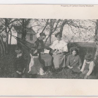 Update 2009: Black and white print postcard. Picture of a small house in back of trees in a little group of trees, two women sitting on a hammock, reading or studying something. On the ground on each side of the women two boys and two girls. Women have books on their laps, one is using her fingers like reading Braille. She has on a white blouse with large collar over sleeves an checked skirt. Other woman has on a dark dress. Boy on far right has on bib overalls. Boy on far left has horizontal stripe shirt. Girls are wearing dresses. Printed in black ink on back: Post Card" "Correspondence Here" "name and Address here". ""A" "Z" "O" triangle forms square around "Place Stamp here".