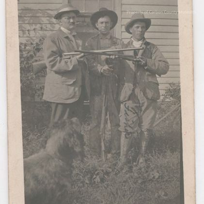 Three men with shot guns and a dog. Note on back to Floyd Hubbard, Fairfield, Nebraska from Fisher.