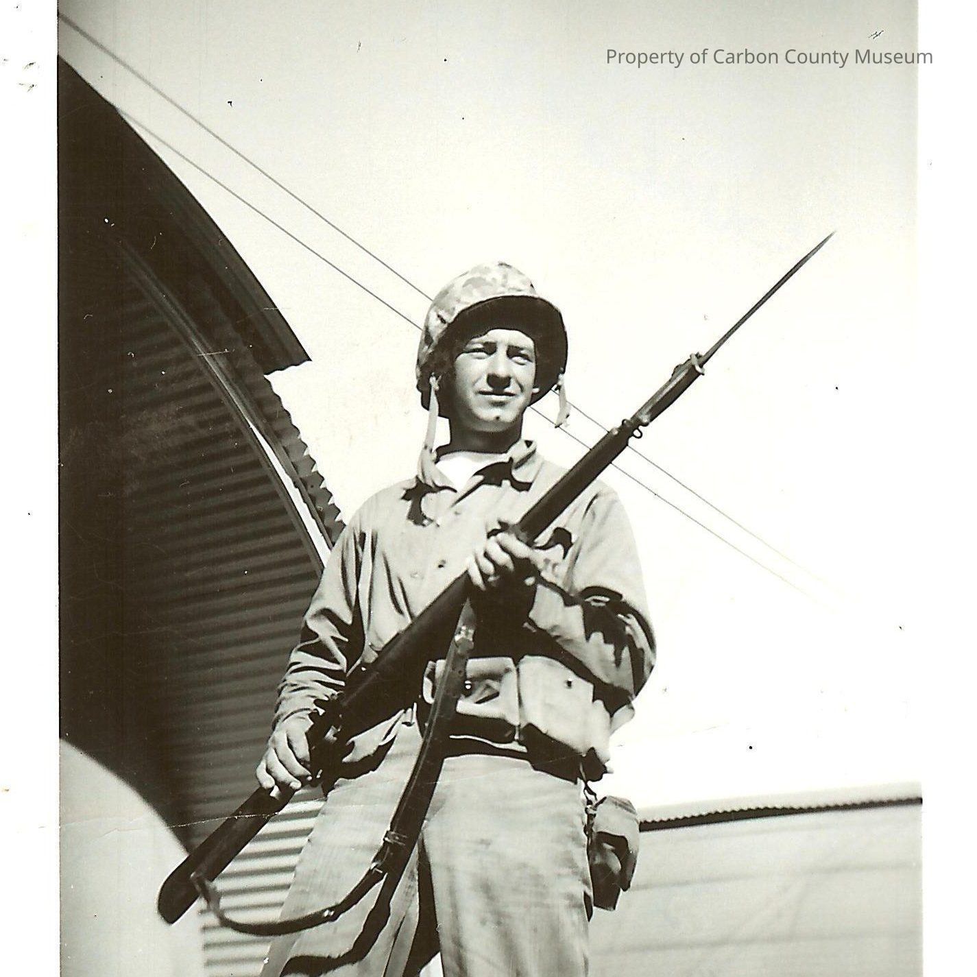 A black and white photographic print of a soldier in uniform and camouflage helmet holding a long rifle with a bayonet attached at the end of the barrel. Soldier appears to be standing in front of a metal roofed building with overhead wires seen. Written on back Guaco-Hou 1-25-51