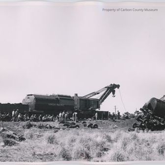 Photo shows a crane in the center of the picture with a Union Pacific car behind it with the number 03044 on the back. A line of people are sitting on the ground and some standing in front of the work train. Wreckage is seen on the right and several sets of train wheels are on the ground. Condition is good. Some scratches and warping.Collection