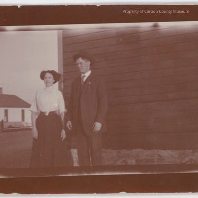 Update 2009: Black and white contact print of man and woman standing beside wood building with rock foundation. Lady is wearing a light colored blouse with high collar an d3/4 sleeves. A dark skirt with shiny buckle on belt. Man is wearing a three piece suite and tie with white shirt. There is a house in the background on photo left. Printed on back in black ink: "Postcard" "Correspondence Here" "Name and Address Here" "Solio" four times to form a square around "Place Stamp Here".
