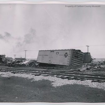 Black and white 8 x 10 photo of a train wreck from July 8, 1952 at Wamsutter where two trains collided and destroyed the coal shute. Carl Sallade was the engineer of the West bound train.