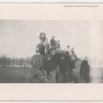 Update 2009: Black and white print of six people sitting on large iron wheeled steam tractor. The wheels in back are larger than front spoked wheels. Above front wheels is a cylindrical horizontal tank, above that is a smoker stack and various tanks and rods attached. Three children are standing on tractor and three women are seated. Printed on back in black ink: "Postcard" "Correspondence Here" " Name and Address Here" triangle "A""Z""O" form a square around "Place Stamp Here". in blue ink addressed to: "Mrs. F. E. Hubbard Rawlins, Wyo. Dear sister....etc.Collection