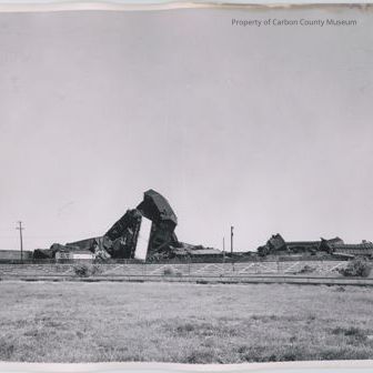 Black and white 8 x 10 photo of a train wreck from July 8, 1952 at Wamsutter where two trains collided and destroyed the coal shute. Carl Sallade was the engineer of the West bound train.