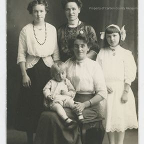 Update 2009: Black and white postcard studio portrait of three women and two children. Woman on photo left is wearing light colored blouse and dark skirt and has on a dark bead necklace. Woman on photo right has on dark satin looking dress with white high neck collar and dark bead necklace. Woman seated on dark bench wears a light colored blouse and dark skirt. She is holding a small child dressed in light jumpsuit and white stockings and dark shoes. Young woman on photo right has on a light colored fancy dress, a bow over her head and tied at the ears and white shoes. See also 1949.068.0534. Printed on back in black ink: "Postcard" "Correspondence Here" "Name and Address here". In upper right corner "A" "Z" "O" triangle forming a square around "Place Stamp Here". Condition good. Edges damaged.Collection
