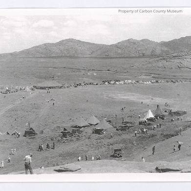 Update - Aug 2010: Black & white paper copy of two rows of tents. In the foreground is a man standing on top of Independence Rock. He is holding a camera & looking down toward the encampment. In the first row starting at photo left there is a small white tent behind a larger tarp enclosure that is flying an American Flag, two smaller tents, a dark colored tent, a vintage car, more small tents & vintage cars. Next, three larger tarp shade coverings with open bottoms, more tents, two tepees & more tents, tepees & one very large tarp enclosure. Men, women & children are walking about the entire scene. Rocky hills & a stream are in the distance.