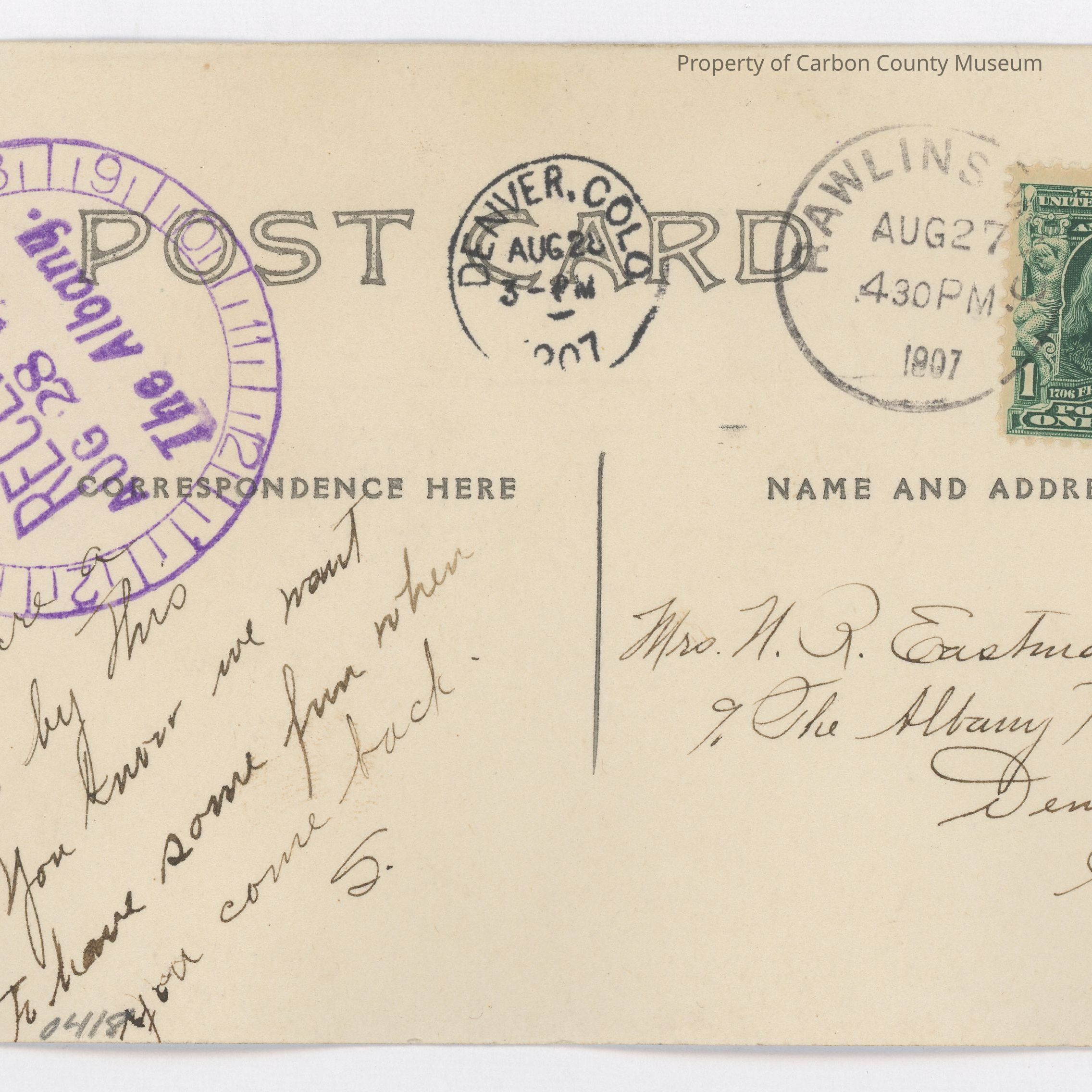 Update 2009: Black and white print postcard of four men and three women standing on steps in front of stone building . Man on left has left foot one step higher than right foot. He has on dark slacks and vest, white shirt, and dark Derby hat. Other three men have on dark three piece suits, white shirts and light colored cowboy hats. Lady on photo left has on dark long skirt, white long sleeve blouse. Lady on photo right has on light colored long skirt and white long sleeve shirt and dark belt. Lady behind her has on dark dress with white blouse. Dark wood, large, double doors are behind them. Written on front in black ink: "this view is more comprehensive but not as plain as the other". "Shb" written on front in black ink: "The Thief". and an ink mark drawn between necks of man on photo left and lady on photo left. Written on back in black ink: "Mrs. N. R. Eastman to the Albany Hotel Denver Colo." "Hope you are a lot better by this time. You known we want to have some fun when you come back. S". Postmark in circle "Rawlins AUG 27 4:30 pm 1907" Postmark in circle "Denver, Colo AUG 28 3pm 1907". Motel stamp circular numbered dial with arrow pointing one mark past 4 "Received Aug 28 4:15 pm The Albany". Green stamp in upper right corner: "Series 1902 United States of America" Postage One Cent" "1706 Franklin 1790" Picture of Benjamin Franklin. Condition good, written on front in ink, soiled, bottom edge wrinkled, postage stamp impacted emulsion on front.Collection