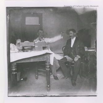 2 black & white contact prints made from glass plate negative Package5, No. 147. Snapshot. Image of two men seated by a table in a messy room. Table has a white coth, pitcher, fabric & an open box with mechanical/electrical machine inside on top. Trunk on floor at right. Man behind table is dressed in a white lab coat & light-colored pants & is holding an object against the forehead of the second man. Second man is dressed in a dark 3-piece suit, white shirt & white bow tie and is holding a sponge(?) in his right hand. His hat is setting on the trunk & he has a large mustache.