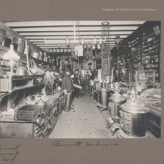 One glossy copy print: Typed on adhesive tag on back: "Bennett Hardware Store, Rawlins J. A. Bennett, Ed Bennett, Tom Reid"