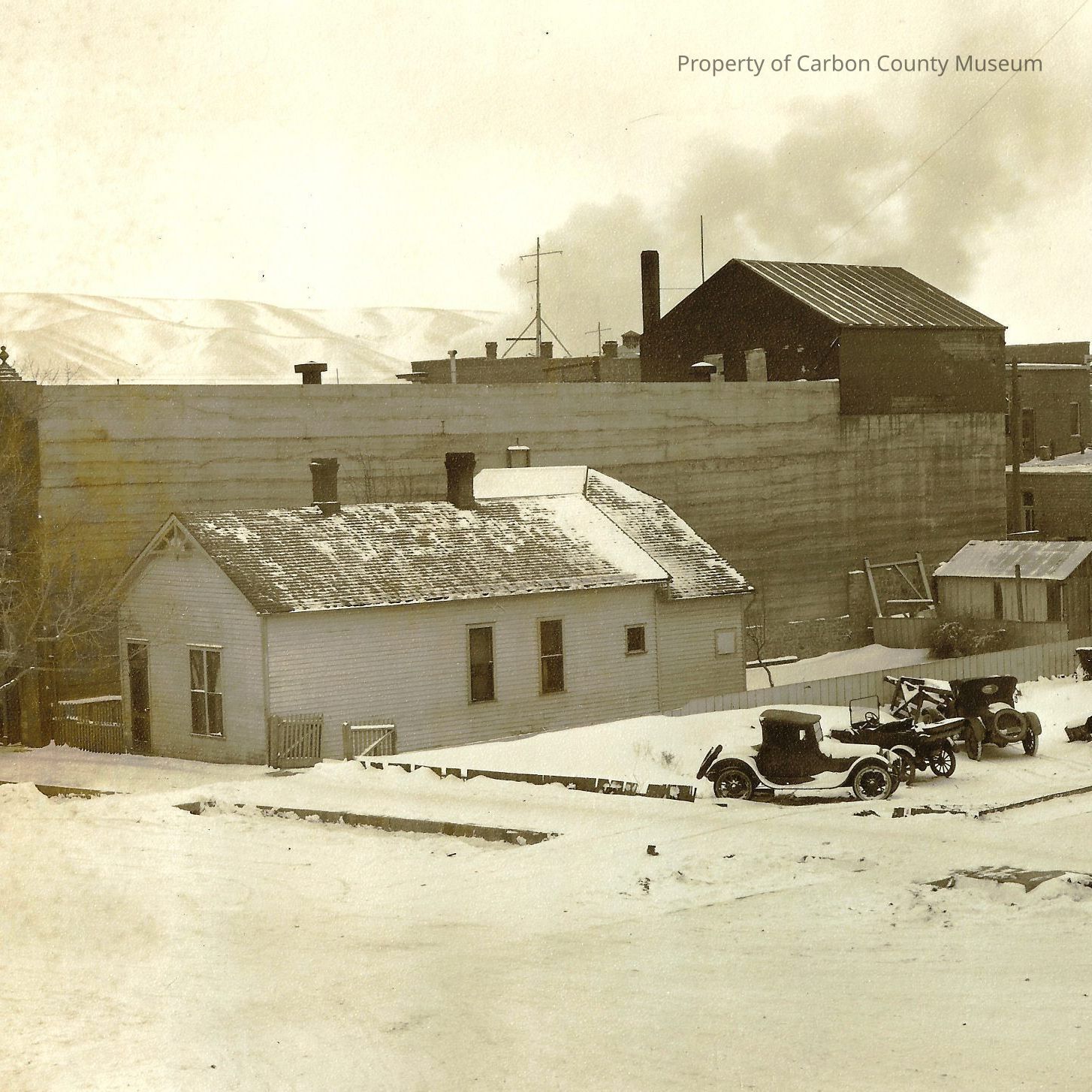 Update - 2009. Black & white print of snowy city streets. On photo right on buildings is: "Rawlins Garage Studebaker Cars" "Harry E McFarland Groceries & Fresh Fruits". Near photo center is garage with double sliding doors. Painted on front: "White Transportation Co. Inc. Phone 523" Two trucks are parked on street & three cars are parked in lot. Two more cars are in lot with parts missing. Another building reads: "Furniture" & another: "Star" "Velvet". A clapboard house is on 6th Street, A multilevel brick & concrete building is next with a taller extension on back. A shorter building reads "Florist". Next building has a one slope roof & is rock.