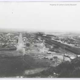 Update - May 2010: Black & white glossy contact print & one copy print. Image shows a birdseye view of a town with railroad yards on right, primary roads running vertically from hill. Sparse vegetation in foreground & distance with buildings & other structures seen throughout.