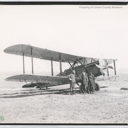 Update February 2011: Black & white contact print of a bi-wing airplane. Painted on side of plane: "U S MAIL". Three men, one with goggles on his head above his eyes, are standing in front of the plane. Chocks are in front of the plane's wheels & a wood box is set in the ground on photo right. Plane is tethered to the ground by wing in the foreground.
