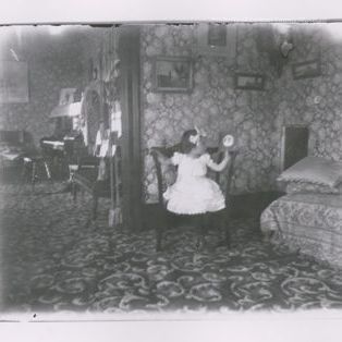 Black & white contact print. Made from glass plate negative, Box 12, No. 103. Snapshot. Image of a young girl in a frilly white short-sleeve dress sitting in a wooden chair. She has a large white bow in her hair & is wearing dark tights & shoes. She has her right hand on the high arm of the chair & is holding a photo in her left hand. Patterned carpet, floral wallpaper cover all visible surfaces except the trim. Patterned throw on bed/couch at right. Piano in room to left.