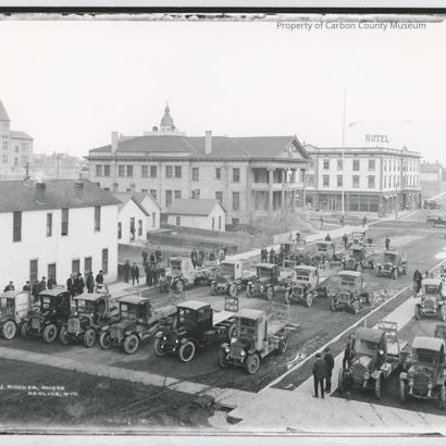 Update February 2011: Black & white contact print of rows of vintage trucks on Buffalo Street. Six trucks are in front row with flat beds, five in the next row, then four & one in the last row. Three more are parked on photo right across the sidewalk on Buffalo. The Ferris Hotel is in the distance & printed on the lower level window is: "Transit Co.". One vintage car is at the hotel, two more on the streets. The Benevolent Protective Order of Elks building is next toward photo front, then the Cottage Hotel. Old Central School is in the background as well as the steeple of St. Joseph's Catholic Church. Men are standing on the walks & beside the trucks. A child is in a doorway of house next door to Cottage Hotel & a woman is on the sidewalk in front of Ferris Hotel. In white on photo bottom left corner: "H. J. Rogner Photo Rawlins, Wyo"