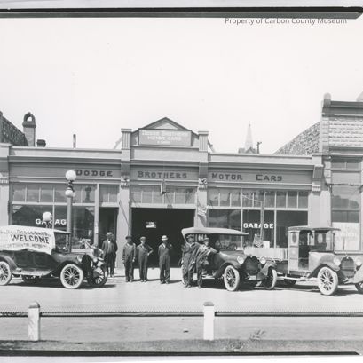 Update - September 2010: Black & white glossy print of a car sales & garage. The building has large glass windows on the sides with "GARAGE" printed on them. A large drive thru door is between the windows, smaller windows are above. Written on a peaked facade on top of building: "Dodge Brothers Motor Cars" The same is written above the small windows in a line across building front. Parked in front of building on photo right are two vintage vehicles, one is a truck with flat bed & board sides. It has oval windows on sides of cab & a windshield with dark metal rim around it. The other is a car with soft top, two men are beside it, one has his foot on the running board & elbow rested on door. Three more men stand in photo center in front of drive thru door. Another man in dark three piece suit stands by a vintage car on photo left. A large banner is on the side, it reads: "Rawlins Dodge Bros. Service Station Welcomes Transcontinental Motor Convoy" In foreground is a white post & sawtooth pattern railing, low fence.