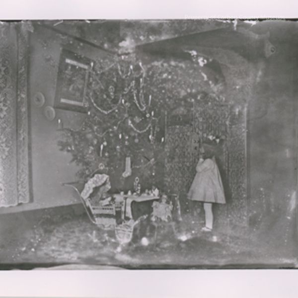 2 black & white contact prints. Made from glass plate negative package 6, No. 160. Snapshot. Image of a young girl standing & looking at a large decorated Christmas tree. She appears to be using an old fashioned wall telephone. She is wearing a light-colored dress, white tights & black shoes; there is a large white bow in her hair. In front of the tree is a small chair with a doll sitting in it, a small table set for tea & a wicker doll stroller containing a second doll. Patterned carpet on floor; patterned wall paper in background & floral lace curtain at left.