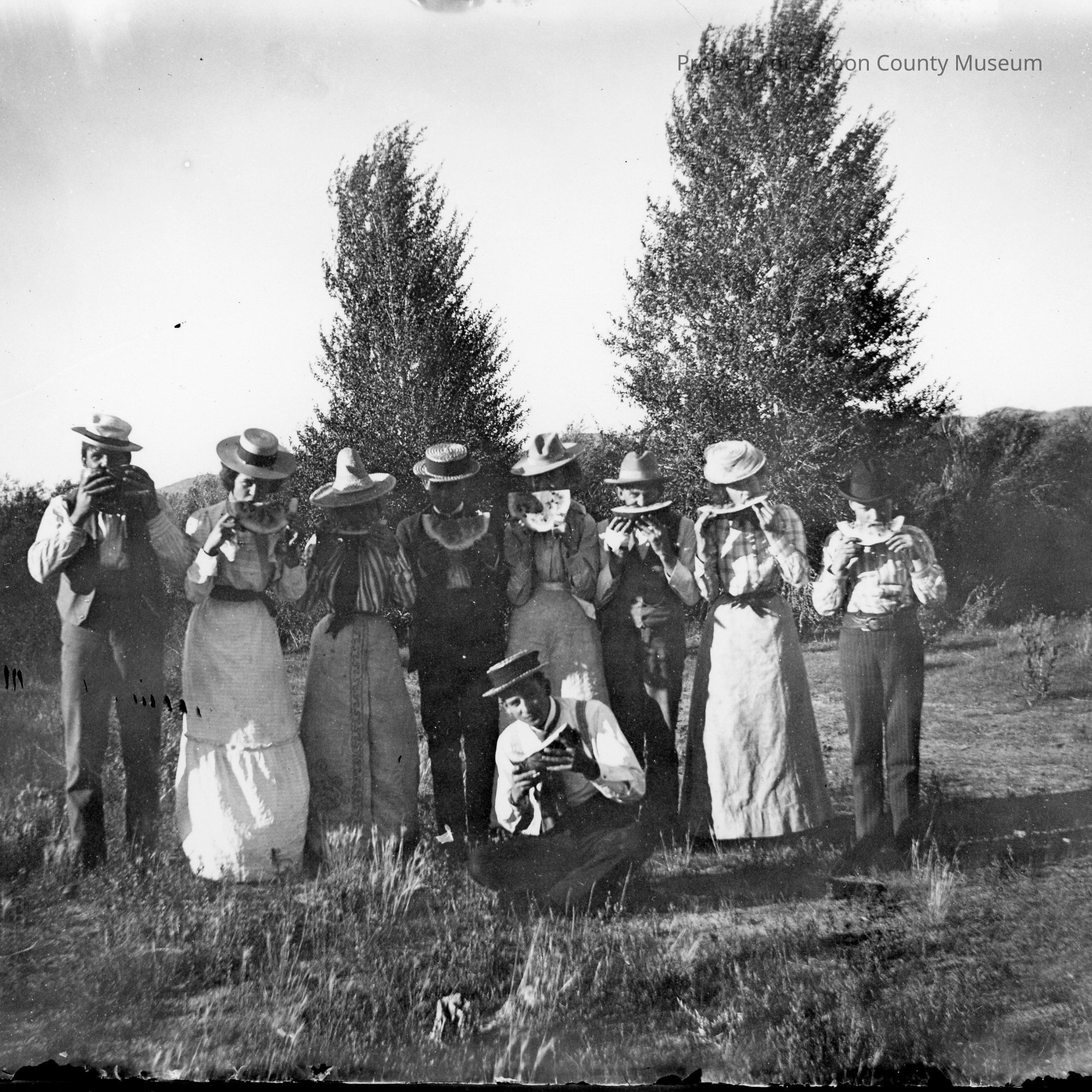 2 black & white contact prints. Made from glass plate negative, Box 10, No 92. Snapshot. Image of a group of people eating watermelon, view 2. Same group & location as Acc # 1950.135.0416. Eight people - 4 men, 4 women - standing; one man seated on ground. Trees, bushes & hills in background.