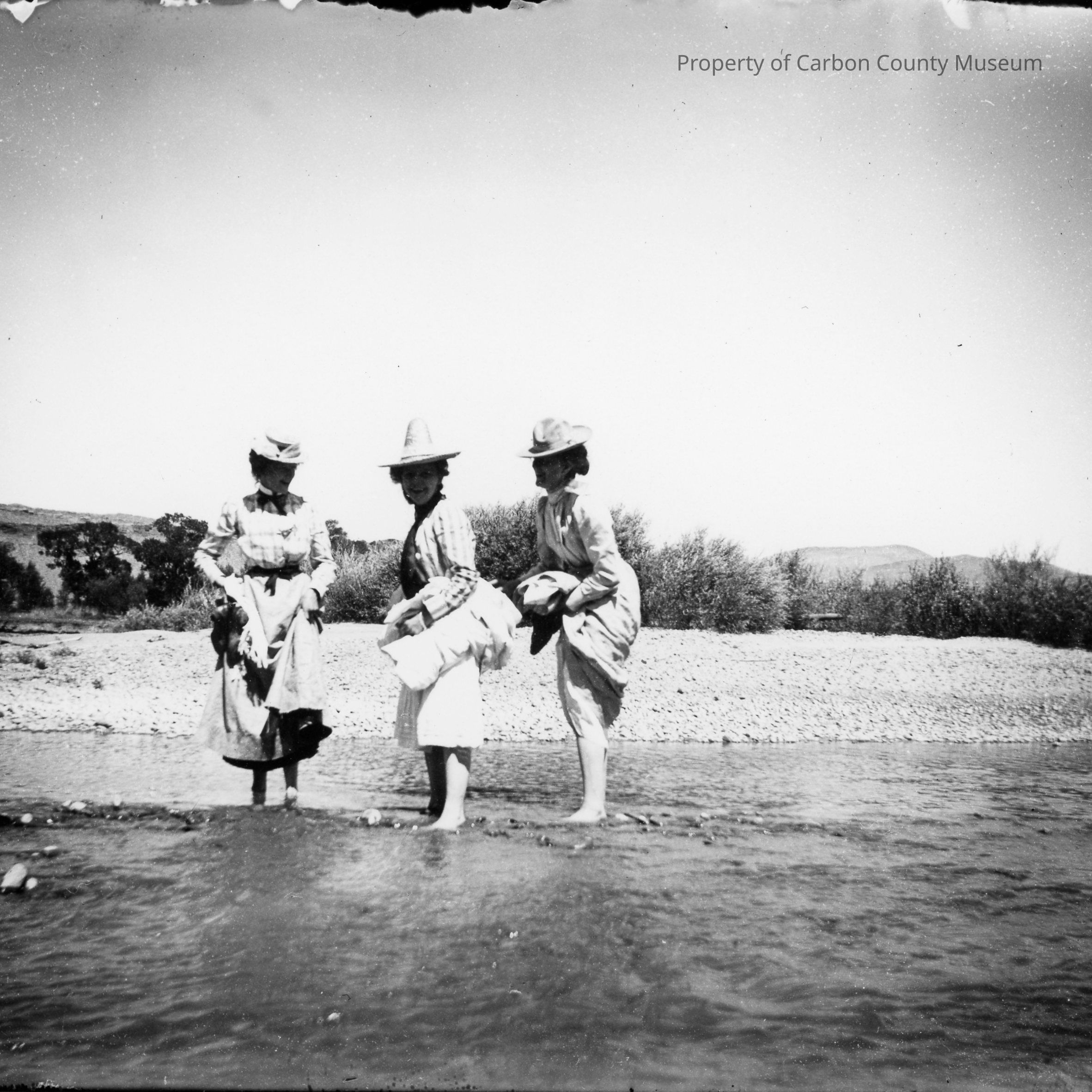 2 black & white contact prints. Made from glass plate negative, Box 14, No. 133. Snapshot. Image of 3 women, wading in a shallow river. Rocky beach, shrubs & hills in background. women all have their long skirts hiked up so as not to get them wet; each is wearing a hat.