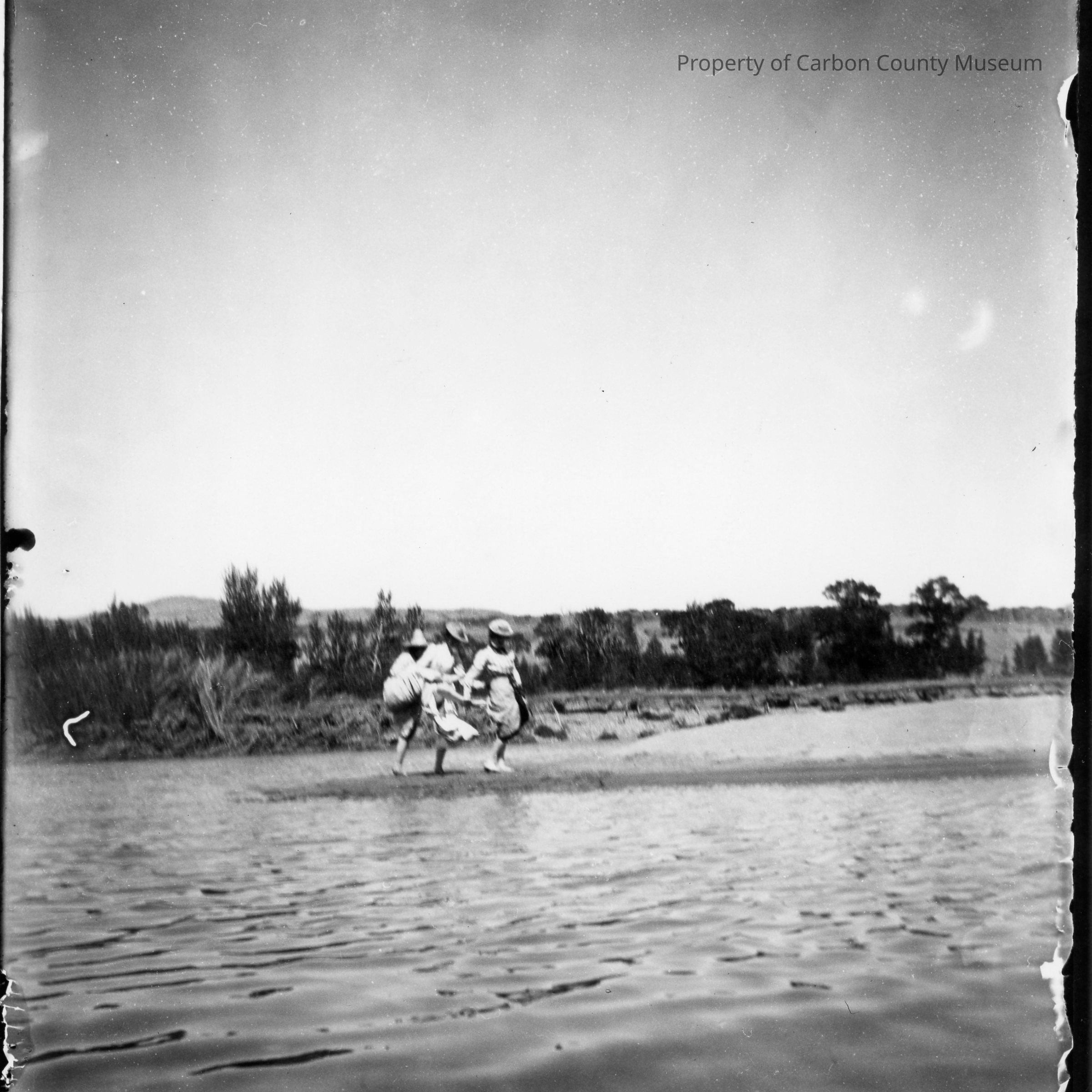 2 Black & white contact prints. Made from glass plate negative, Box 12, No. 110. Snapshot. Image of three women cavorting on the shore of a river. Water in foreground; trees & hills in background. Women have hiked up their long dresses to keep them dry; all are wearing hats.