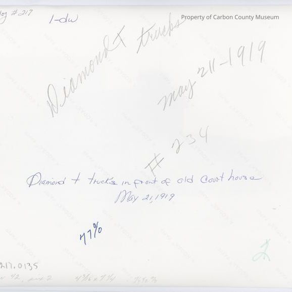 Written on back in blue ink: "Diamond T Trucks in front of old Courthouse May 21, 1919. 1DW 77%"