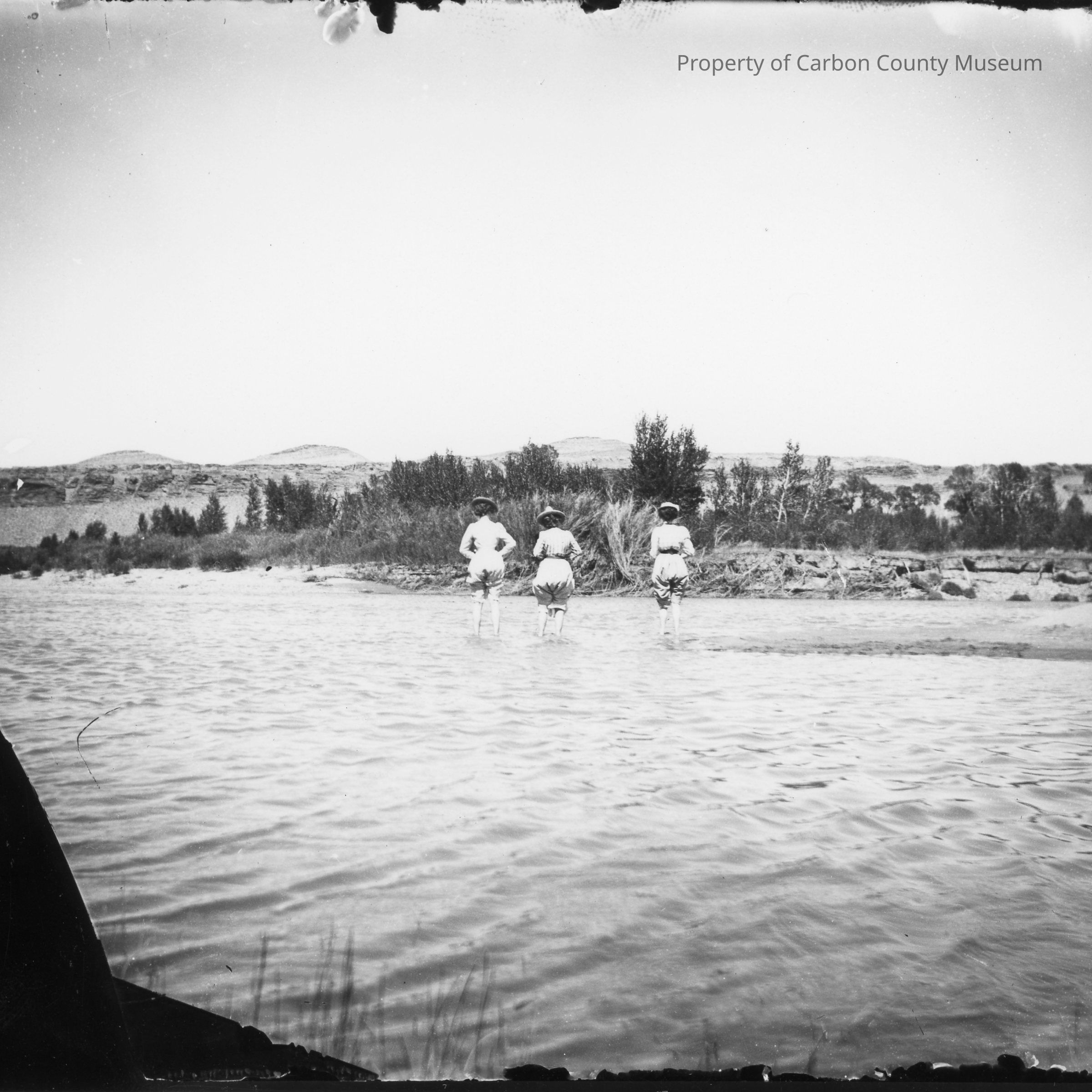 2 black & white contact prints. Made from glass plate negative, Box 14, No. 132. Snapshot. Image of the backs of three women wading in a wide shallow river. Their dresses have been pulled up & forward between their legs. Each is wearing a hat. Shoreline, bushes, trees & hills in background.