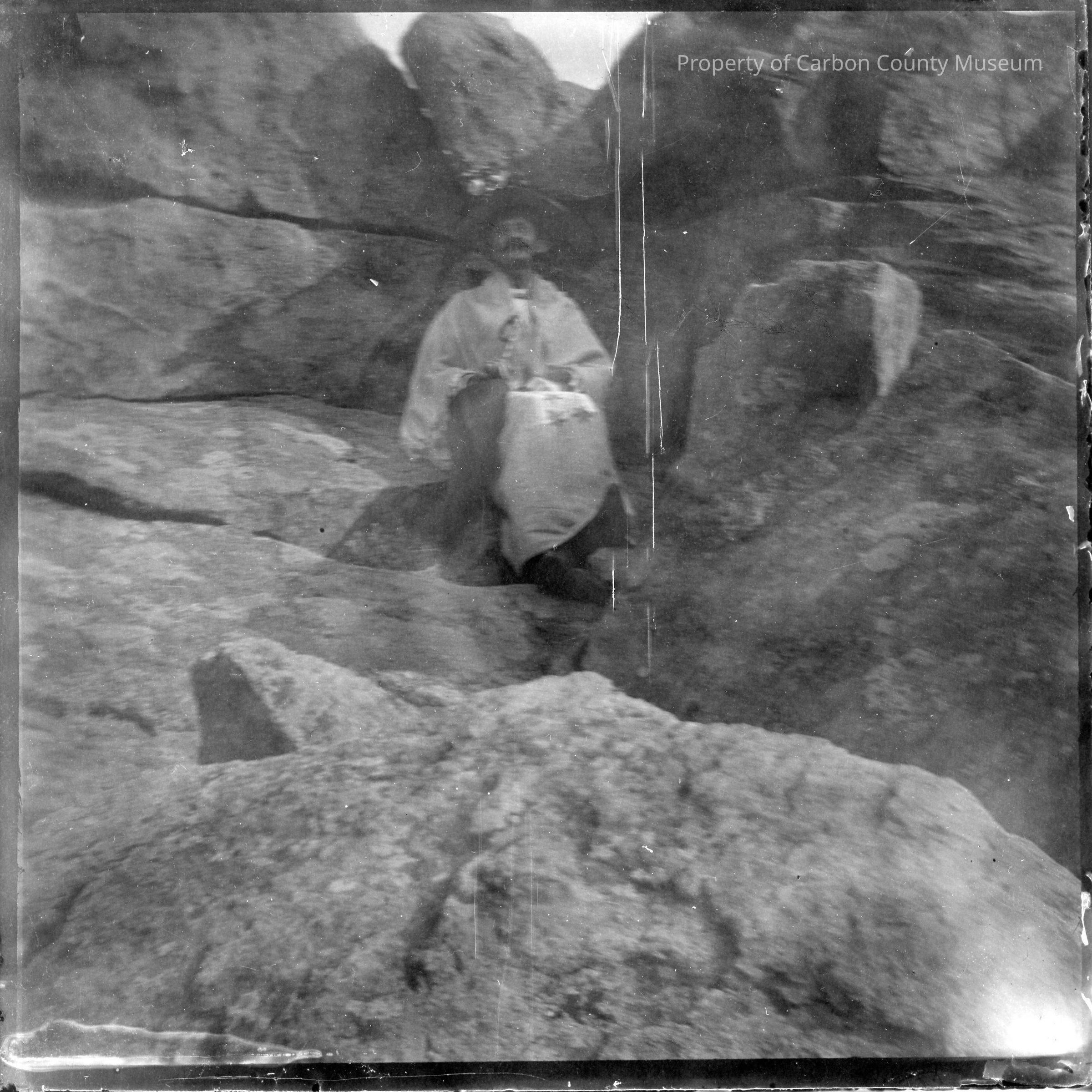 2 black & white contact prints. Made from glass plate negative, Box 15, No. 141. Snapshot. Image of a man seated on a rock outcropping. He has a large mustache & appears to be wearing a long, light colored wrap or robe over a dark suit. He is wearing a wide-brimmed hat.