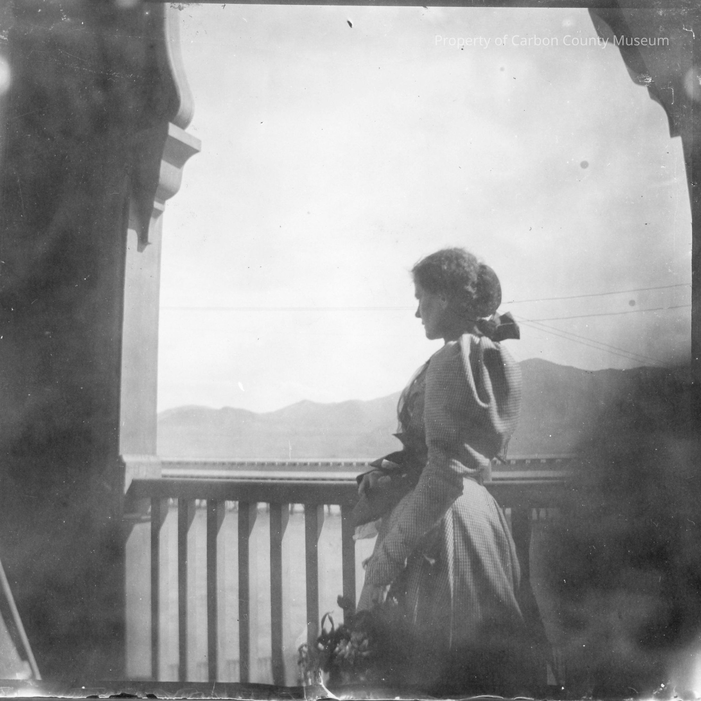 Black & white copy print. Made from glass plate negative, Box 5, No. 35. snapshot. Image of a woman standing by a railing looking out over landscape. Mountains in background. Woman is wearing a long checkered dress with long leg of mutton sleeves. Her hair is pulled back & tied with a large bow. Ornate carved cornices on sides of balcony.