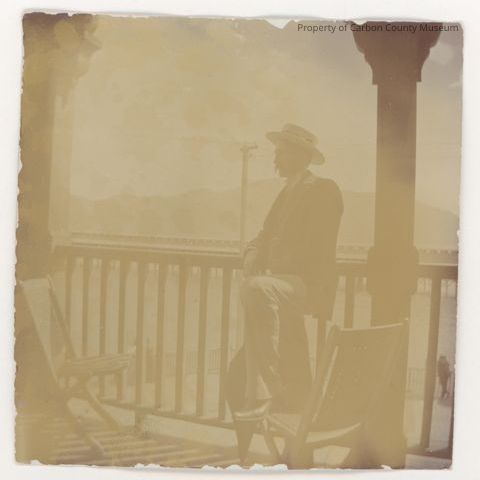 Black & white print. Snapshot. Made from Jungquist glass plate negative. mage of a man standing on a balcony overlooking a fenced yard, prairie & mountains. Man has right elbow resting on balcony railing & left foot on a folding chair. He is dressed in a black suit & straw hat & sports a large mustache. Second folding chair at left.