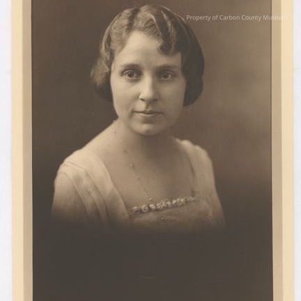 A sepia toned studio portrait print with a wide top & bottom ecru colored outer border & narrow sides; inner border is a light tan color. Image shows young woman with dark updo & dark short, wavy side parted hair. She is wearing a light colored square neck dress with tiny floral decoration on top front edge. A long tiny chain necklace with small pearls interspersed at intervals hangs around her neck. Shoulder edges have wide tucks.