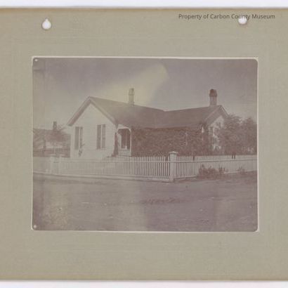 Black & white print attached to gray matboard which has two holes punched into the border at the top edge. Print image is of a white wooden frame house with an L shaped covered front porch is block frame complete with view by dense foliage. Pitched roof has two chimneys; one on each end of roof. A white picket fence surrounds yard. a dirt road is in foreground.