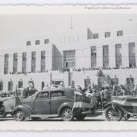 Black and white print of Carbon County Court House. Decorated cars and people are on the street in front of the building. More people are on the bottom level roof. American flags are draped on the cars and wreaths of flowers are seen. Written on the back in pencil: "Court House Dedication, Sept. 1940". Printed in blue oval "Photo finishing Meyers Photos Rawlins, Wyo." Condition good. Emulsion impacted by writing on back.