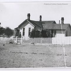 Black & white print of a white wood frame house with multiple roof levels, each with a chimney. Foliage is seen at center front of house view. A white picket & plank fence surrounds yard area. A bicycle is leaning against the fence near gate entrance. A chicken & a dog is seen in the dirt road in the foreground.