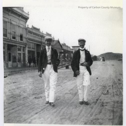 Black & white print of two young men walking up a dirt street with vintage stores in a row on side left. A hill is seen in the distant background. The men are dressed in white pants, white shirts, dark jackets & caps. First building in row is two stories (H. Hansen building) while others appear to be single story. A distant store has a sign that reads Rawlins Drug.