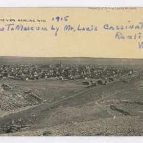 Update - 2009: Black & white postcard: A photo of Rawlins taken from a high position. View is from the west facing east as you can see the old Pen in the far left of the photo. St. Josephs's Church & school can been seen near the center of the photo. The railroad tracks are in the foreground running from the lower left corner to the photo to the upper right corner of the photo. There is a train coming into town because of the steam plum in the upper right corner of the photo. Land is bare from the view point to the town.
