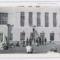 Black and white print of the dedication of the Carbon County Court House. A group of Native Americans are seated on the lawn. they are wearing full native dress including head dress. Written on the back in pencil: "Court House Dedication Sept. 1940." Printed in blue oval: "Photo finishing Meyers Photos Rawlins, Wyo." Condition is good.Collection