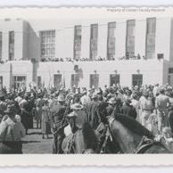 Black and white print of a group of people on the lawn of the Carbon County Court House. Two horse heads are in photo right foreground. Written on back in pencil: "Dedication Court House Sept 1940". Printed in blue oval: "Photo Finishing Meyers Photos Rawlins, Wyo." Condition good. Writing on back impacting emulsion.Collection