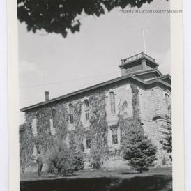 View 2: Slightly closer and more front of building view. Pine trees are in foreground of photo left. Printed in blue oval:" Good Kodak Finishing Meyers, Rawlins, Wyo." Condition good. Scratched, slight creasing.Collection
