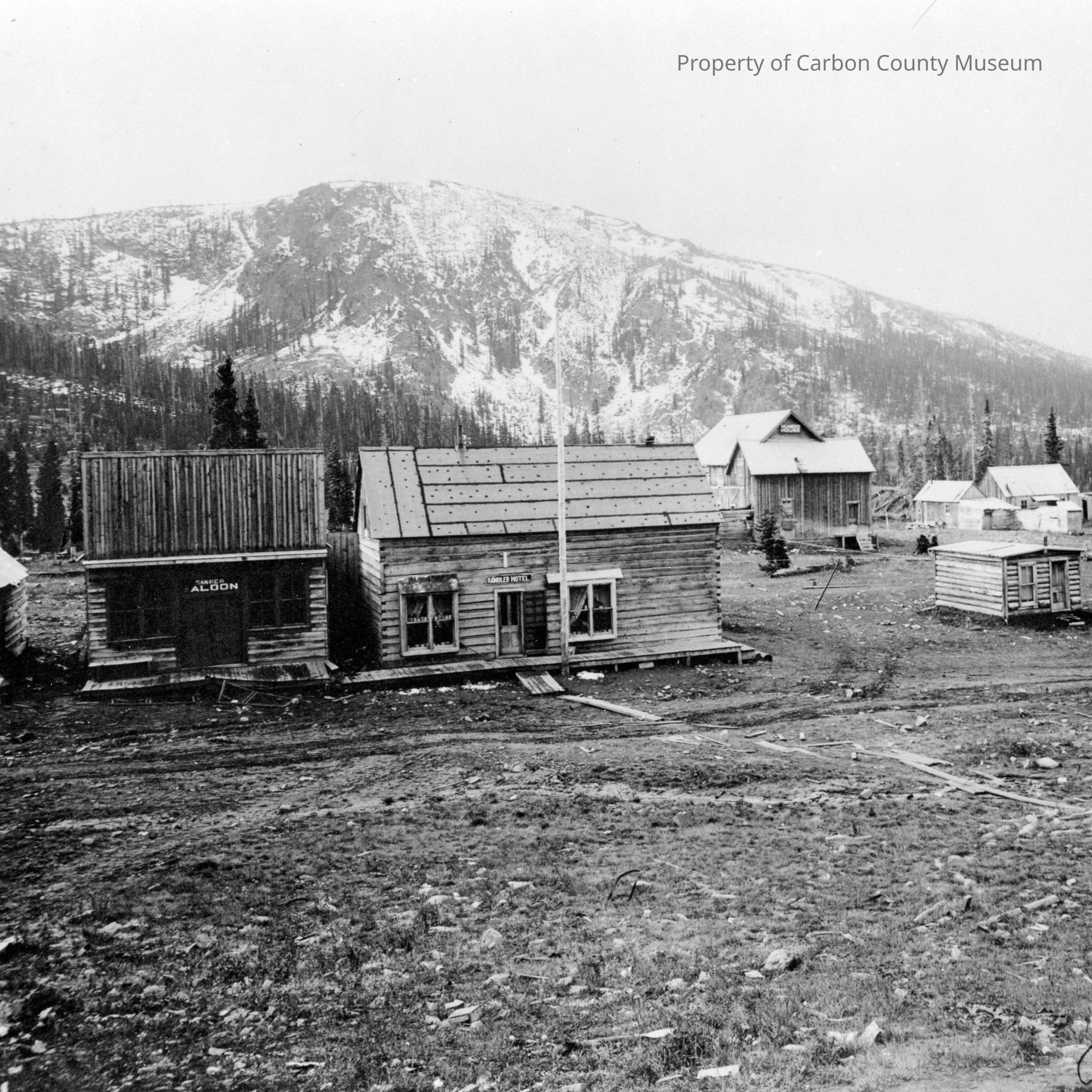 Update - 2009: Black & white photo of mining town of Rambler, Wyo. In the center left of photo are two buildings. The one on the far left has a sign that reads, "Rambler Saloon" The building to the right of the saloon has a sign above the door that reads, "Rambler Hotel". In front of the hotel it looks like a flag pole (but no flag). There are other small cabins to the right & in the background. You can see a mountain in the background behind the town. There is snow on the mountain. There are a few trees in the town. You can see wagon tracks running in front of the saloon & hotel.