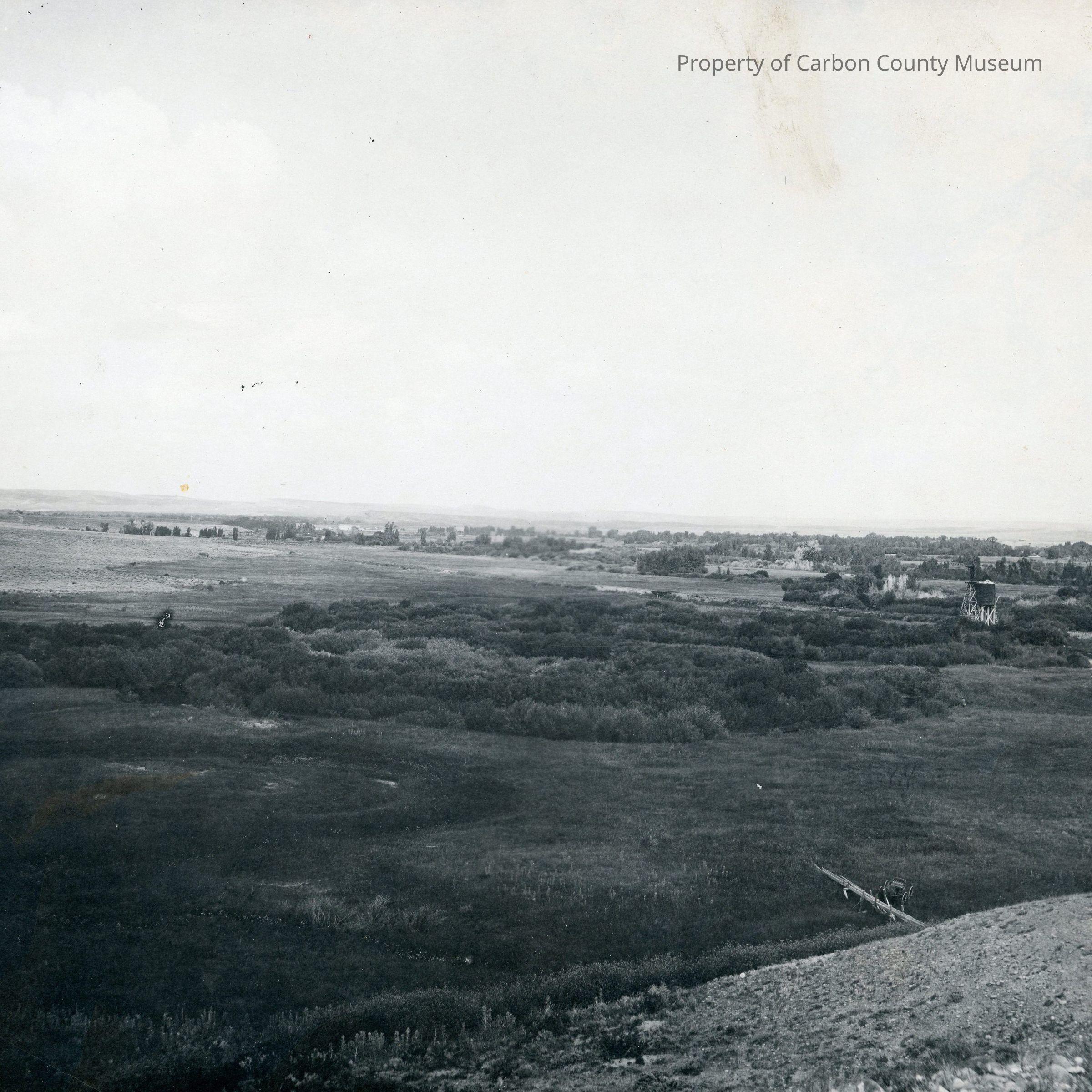 Update 1/2010: Black and white print. Snapshot. Image from slight elevation of a river valley and town admist the sagebrush prairie. Low hills in background. Meander of river at right near water tower. Wooden trough and buggy below rocky hill in night foreground.