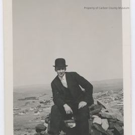 Black and white snapshot print on post card paper. Image of a man in a dark suit. He has on a dark top hat and holds a leather case in his right hand. He sits on a pile of rocks and the city of Rawlins is in the background on a lower level. The Old Wyoming state Penitentiary is in the distance on photo left. Printed on back in black: "Post Card" "Correspondence" "Name and Address" "Place Postage Here". Condition good. Soiled, wrinkled.Collection